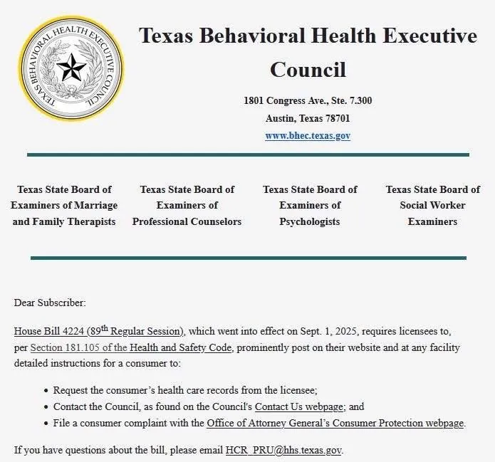To request your records, please submit a written request to your treating clinician or to the practice directly. Requests may be made via email, secure client portal, or in writing. Records will be provided in accordance with Texas law and applicable privacy regulations.